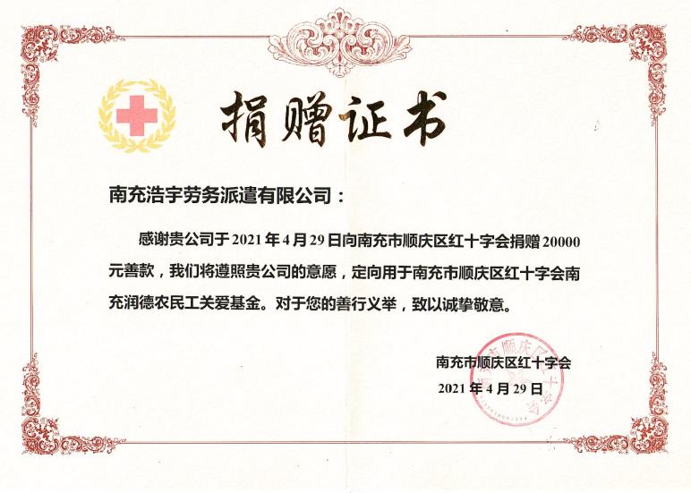 我公司向南充市順慶區(qū)紅十字會(huì)捐贈(zèng)20000元善款